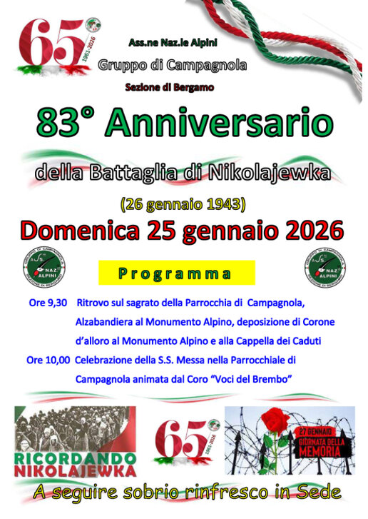 83°Anniversario della Battaglia di Nikolajewka. In allegato troverai il programma provvisorio relativo alla manifestazione che stiamo preparando. L’auspicio è quello che tutti siano presenti per commemorare degnamente coloro che in terra di Russia hanno sacrificato la loro vita nella tragica ritirata.